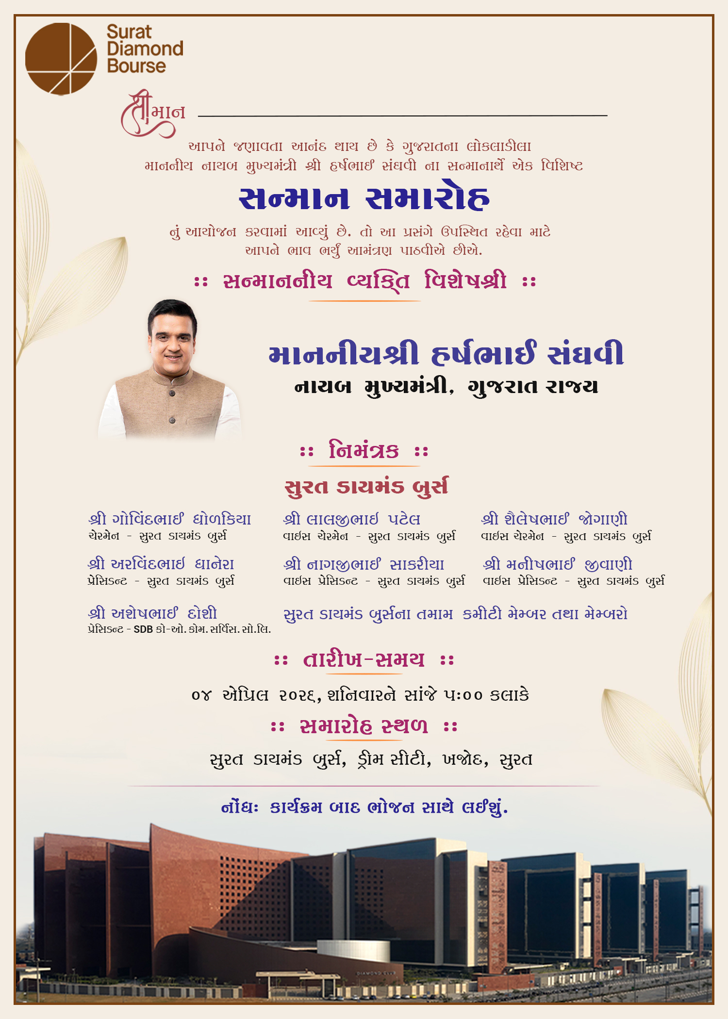 The event was honored by respected members of Surat Diamond Bourse – Shri Vallabhbhai Patel, Shri Govindbhai Dholakiya, Padmashri Shri Mathurbhai Savani, Shri Asheshbhai Doshi, Shri.Kishorbhai Koshiya, Shri.Manekbhai Lathiya, Shri. Dharambhai Patel, Shri.Manubhai Davariya, Shri.Tulshibhai Monpara, Shri.Dayabhai Jivani, Shri.Nithinbhai Adani, Shri. Chandrakant Sanghvi, Shri. Nareshbhai Lathiya, Shri.Mathurbhai Sojitra, Shri.Ashokbhai Doshi, Shri.Manharbhai Saspara, Shri. Vallabhbhai Kakadiya and all Surat Diamond Bourse office owners.